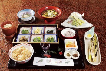 - 代表メニュー:山菜やきのこを使用した季節のメニュー/ 4,000(税別)